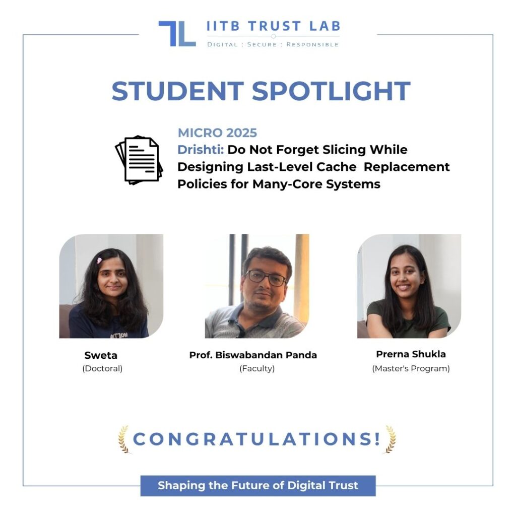 Congratulations to Sweta (PhD Student) and Prerna Shukla (MS Student) for their paper Drishti: Do Not Forget Slicing While Designing Last-Level Cache Replacement Policies for Many-Core Systems being accepted at MICRO 2025!