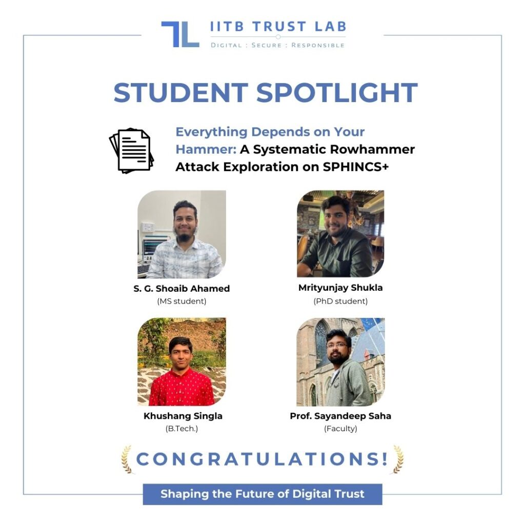We’re also thrilled to celebrate the recognition of our work at ICCAD with the paper titled Everything Depends on Your Hammer: A Systematic Rowhammer Attack Exploration on SPHINCS+, authored by S. G. Shoaib Ahamed (MS Student), Mrityunjay Shukla (PhD Student), Khushang Singla (B.Tech Student), and Prof. Sayandeep Saha.